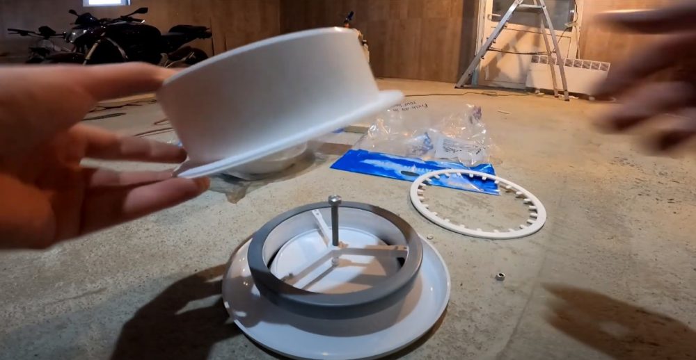 Материалом производитель использовал ударопрочный АБС-пластик. Из монтажных элементов в комплекте поставляется фланец с удлиненной муфтой.