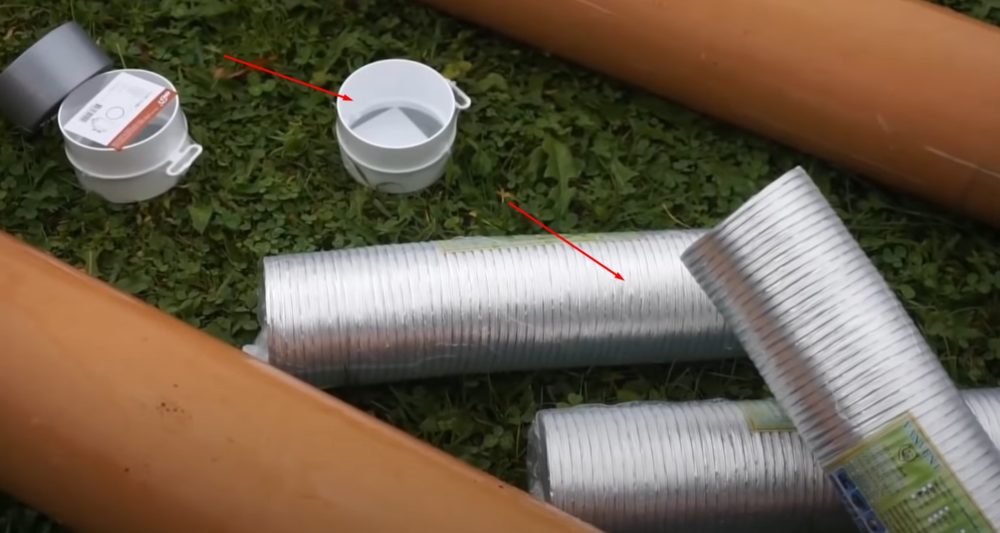 - Сборку начинаем с подготовки материалов. Для кожуха понадобится 2 ПВХ трубы диаметром 160 мм, длиной 2 м. Из фасонных элементов подготовьте 2 переходника 160х110 мм, 3 тройника 160х110х160 мм, 2 колена 160 мм, 1 муфту 160 мм. Для внутреннего канала нужны 3 алюминиевые гофры диаметром 100 мм и соединительные муфты.