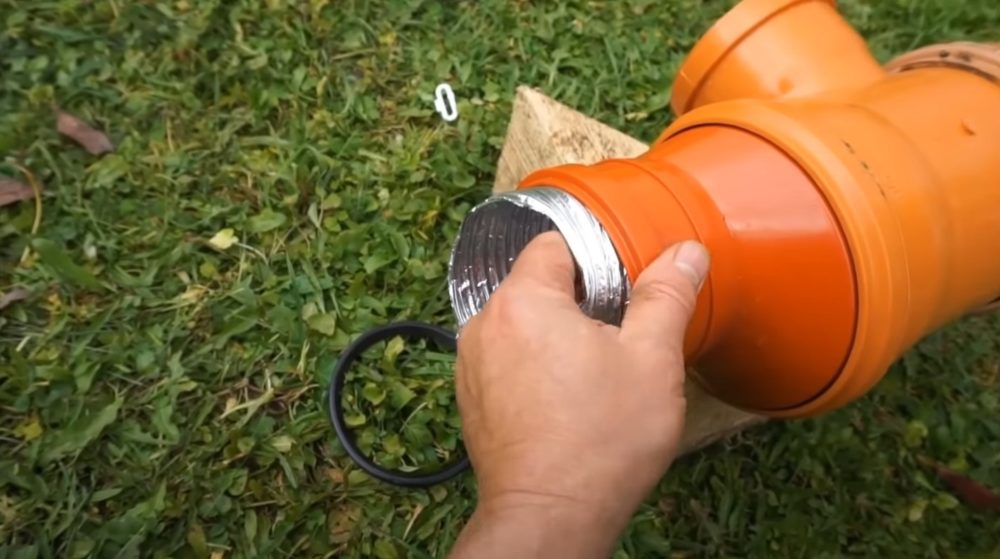 - Возьмите конец трубы из двух соединенных гофр. Заведите внутрь ПВХ кожуха, чтобы край вышел из отверстия переходника 160х110 мм.