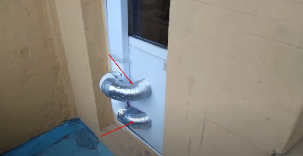 - Установите собранный своими руками рекуператор на балконную дверь. От патрубков нижних вентиляторов гофрой подключите каналы к заслонкам, врезанным в тело дверного полотна. На верхний подающий вентилятор наденьте патрубок и фильтрующую ткань.