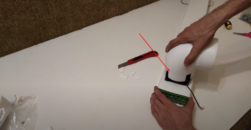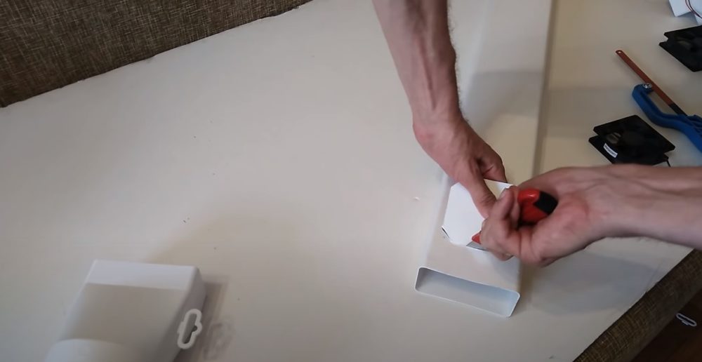 - По краям прямоугольного короба отметьте 2 места под установку кулеров. Вырежьте отверстия ножом.